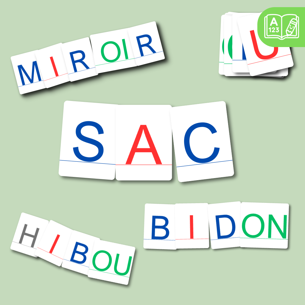 - Compatible avec les supports Mini & Malice (ex : Cartimo) : l’enfant voit une image, forme le mot avec les lettres, puis retourne la carte pour vérifier (non inclus).