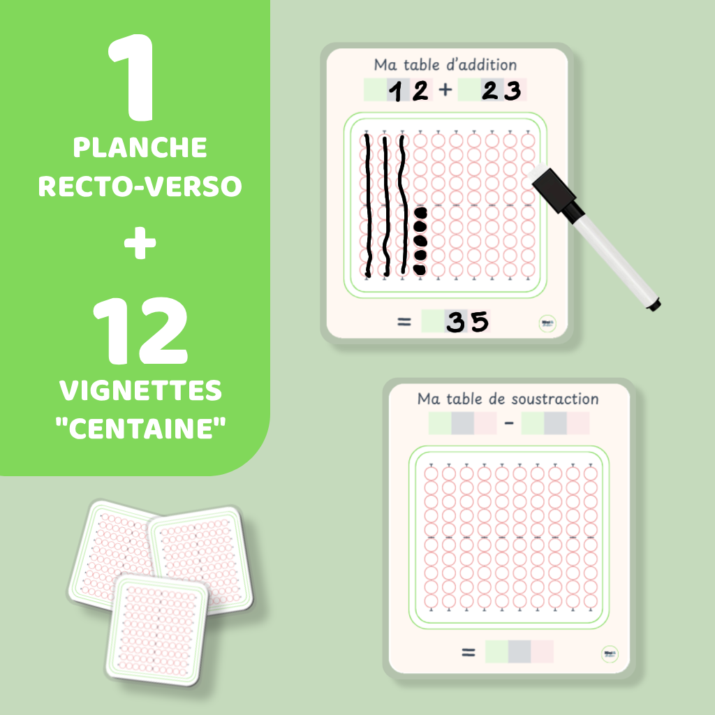 - 1 planche plastifiée recto-verso (addition / soustraction)