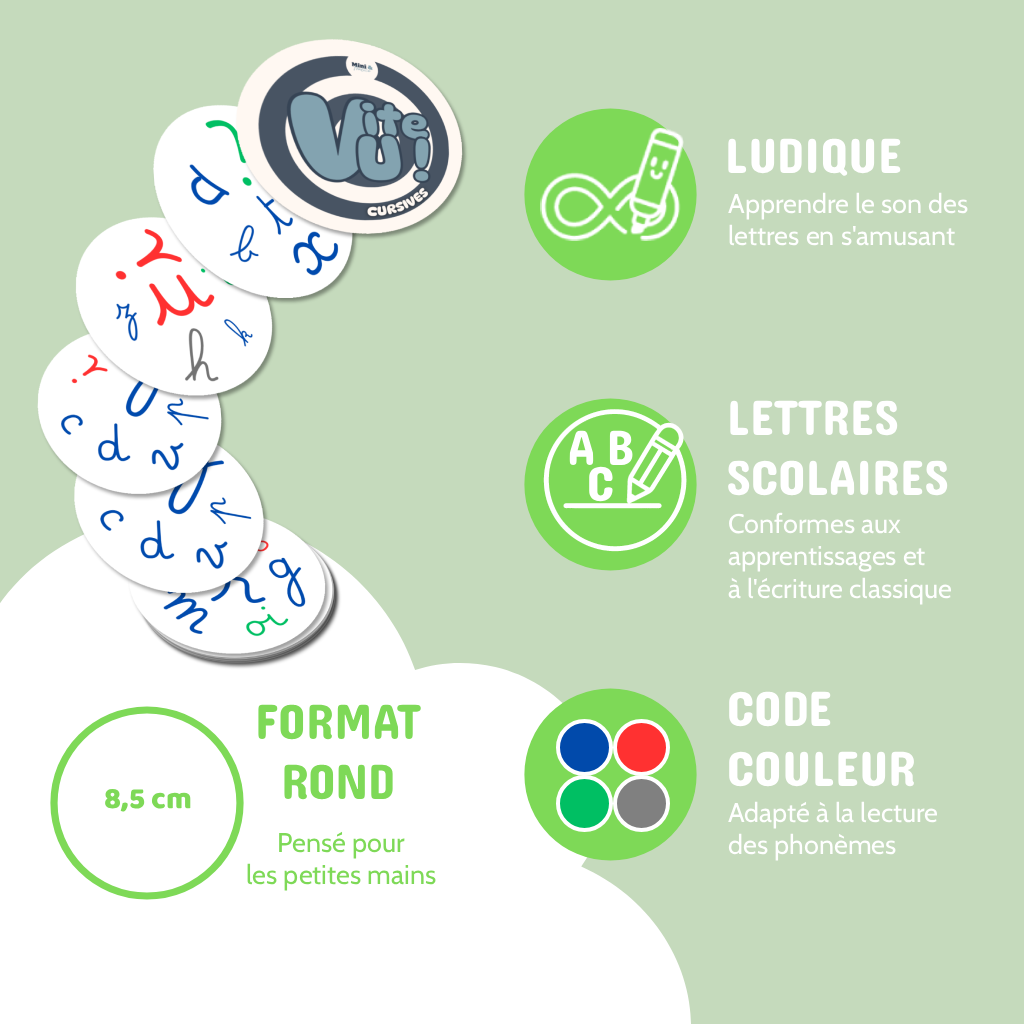 InspirĂ© du cĂ©lĂšbre jeu Dobble, Vite Vu ! propose 31 cartes avec les 26 lettres de lâalphabet et 5 digrammes : ou, oi, ch, gn, an en version cursive.